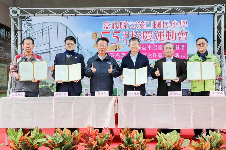 崙禾社企創辦人藉此在母校捐贈一座小型溫室農場 崙禾社企創辦人與嘉義大學林翰謙校長、民雄農工鍾順水校長、北港農工楊長鉿校長、及溪口國中謝正裕校長簽署培育青農人才合作意向書,讓對於智慧農業有興趣也願意留鄉務農的青年們畢業即有能力就業~亦即成為專業的農業人才。